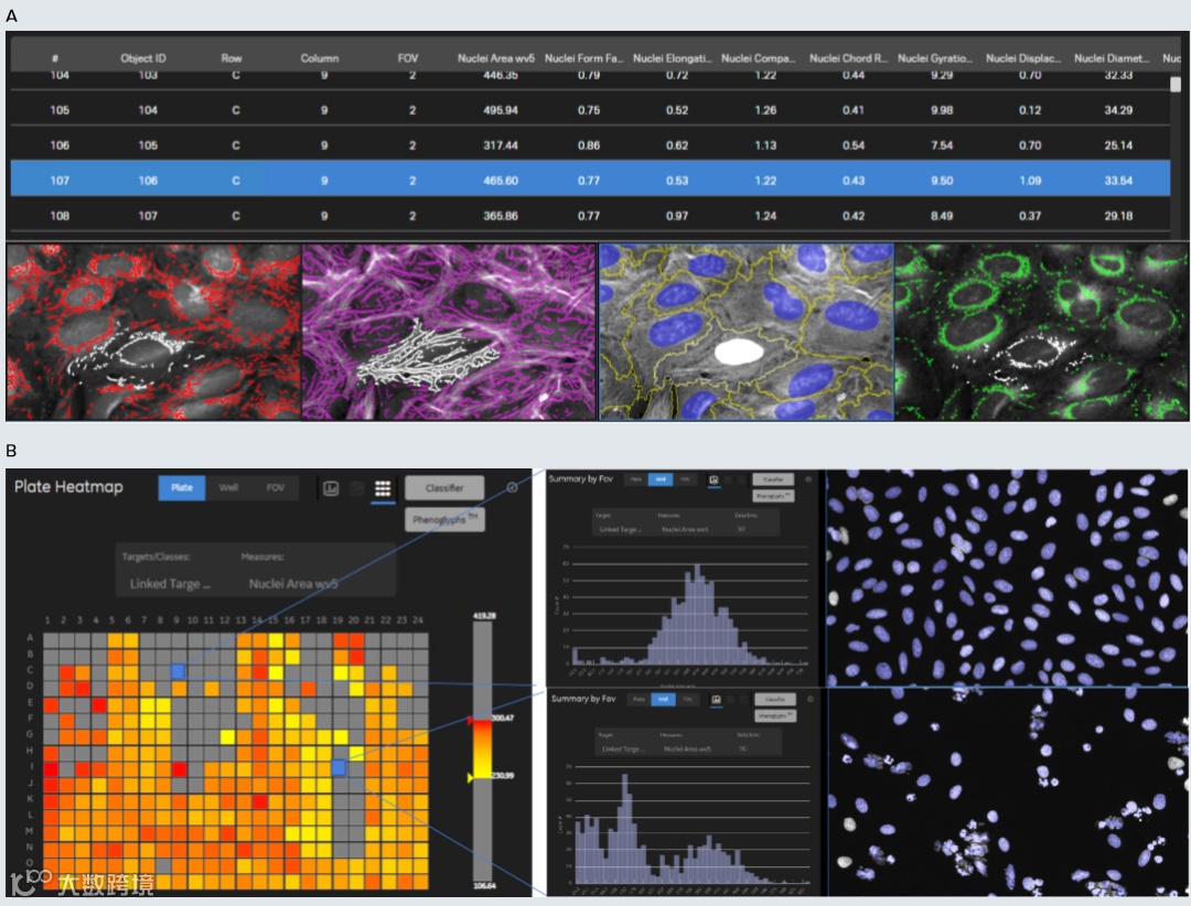 Figure 4. IN Carta 软件中的数据显示。这个软件拥有多种可视化的工具用于对数据的探索。A) 显示的测量值链接到图像中的对象,可以通过单击测量表中的一条线或图像视图面板中的对象/单元格来进行选择。被选中的目标在途中使用白色的覆盖标识显示出来。B) 热图和直方图等选项可用. 被选择的参数可在孔板示意图中使用热度显示出来。可以调整热图比例,以便仅显示选定的值范围。直方图显示也可用于轻松查看所选测量的分布情况。测量可以导出为 csv 格式以进行进一步的数据分析。
