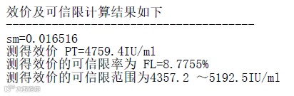 根据 F 检验的统计分析结果,如果符合药典中可靠性测验结果判定条件,那么实验结果被认为是可靠和有效的。只有实验结果是有效的,方可按等反应剂量比的原则,计算供试品的相对效价 R 和效价 Pt 及其可信限和可信限率,反之,实验结果不成立,R 和 Pt 的结果是无效的。药典对 4.4 法可靠性检验结果的要求是:回归项非常显著(P<0.01),偏离平行、二次曲线和反向二次曲线各项均不显著 (P>0.05),满足这些条件才能判定实验结果成立。使用 SoftMax Pro 7 软件对相对效价 R 、R 对数的标准误 SM 和供试品效价Pt及其可信限和可信限率进行计算,结果见图 6 上, BS2000 软件的计算结果见图 6 下。两个软件计算的效价 Pt 都在客户允许的产品质量标准浮动范围内,可信限率都小于 10% ,符合药典对肝素产品的要求。