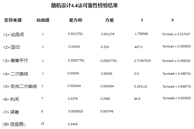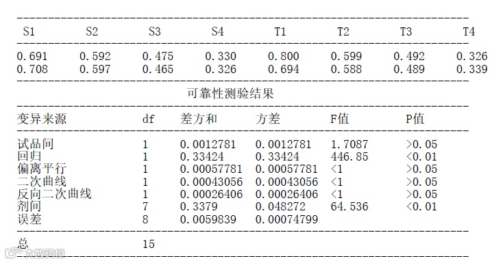 按照药典量反应平行线测定法中方差分析的要求,将总变异进行分解:总变异、剂间变异、区组间变异(随机区组设计)和误差变异,再通过对剂间变异的分析,以检验标准品和供试品的对数剂量和反应的关系是否显著偏离平行直线。4.4 法的剂间变异被分解为以下 5 个变异项:试品间变异、回归变异、偏离平行变异、二次曲线变异和反向二次曲线变异。药典列出了各个变异项及其自由度的推算公式,我们将这些公式编辑到 SoftMax Pro 7 软件中,上述实验检测数据的方差分析和可靠性检验结果将会被计算出来(见图 5 上)。小编将上述实验检测数据手动输入 BS2000 软件,需要注意的是,输入数据时应按照剂量递增的顺序依次输入吸光度值,供试品的标示效价 At 为 5000IU/ml ,接着选择数据不转换和完全随机,最后得到方差分析结果(见图 5 下)。通过比较,两个软件获得的可靠性检验结果是一致的。