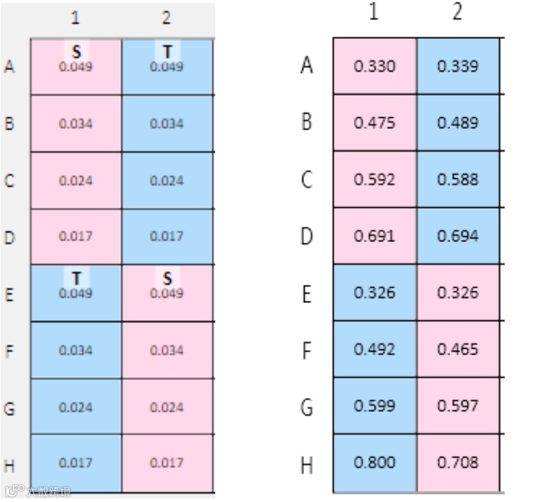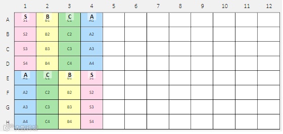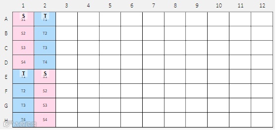 为了减小实验系统操作误差,实验人员应该按照均衡分配各样品在 96 孔微孔板中的不同位置。例如在一块 96 孔微孔板上分配一组标准品溶液 S1~S4 和一组供试品溶液 T1~T4 ,可以采用 STTS 的样品排列方式(见图 1 )。操作熟练的实验人员可以选择同一次反应内测定多批供试品的效价,同时测定两批供试品(A 和 B )可采用 SABBAS 的排列方式;依次类推,同时测定三批供试品(A、B和C)可采用 SABCCBAS 的排列方式(见图 2 )。