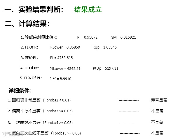 当标准品 S 和供试品 T 的对数剂量和反应关系的两条直线相互平行时,供试品和标准品的活性组分才是相同的,进而才能计算 S 和 T 的等反应剂量,从而对比出供试品的效价 Pt ,所以曲线的平行性分析是生物效价测定的前提。在 SoftMax Pro 软件中,以对数剂量作为横坐标,吸光度值作为纵坐标,对 S 和 T 进行平行线性拟合(即线性约束模型拟合),两条直线强制变为平行, S 和 T 拟合方程的 B 参数(代表斜率)的估计值是相同的,仅 A 参数(代表水平截距)的估计值不同。在 95% 的置信水平下,软件自动计算出 F 检验概率值 (F Prob),见图 4 红框所示, F Prob>0.05 ,表明两条直线是平行的,反之两条直线是不平行的。