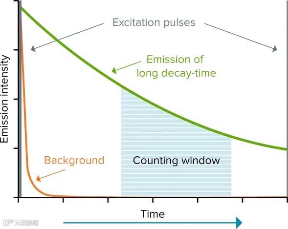 Molecular Devices 公司将 WB 检测与微孔板读板机相结合,在这个检测中,主要利用了上面提到的时间分辨荧光( Time-Resolved Fluorescence ,简称 TRF )功能,它是多功能微孔板读板机的主流检测功能之一,通常需要配合镧系元素作为荧光染料来实现时间分辨荧光的检测。说到镧系元素,和普通荧光染料相比,它们较为特殊,均为金属,也均是稀土元素的成员。它们有着普通荧光染料所不具备的长荧光寿命,普通染料的荧光寿命基本都在 ns 级别,而它们却都在 μs 甚至 ms 级别。所以,和普通染料只能激发和检测同时进行的模式不同, TRF 配合镧系元素可以将激发和检测两者分开进行,也就是先激发、然后停止激发、最后延迟检测。整个过程可以用下图概括: