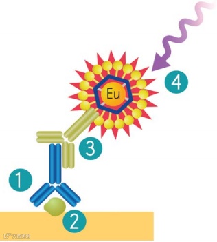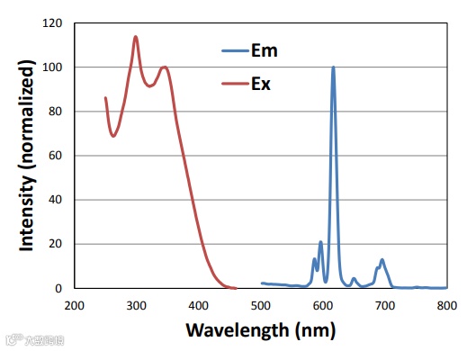 从示意图中我们可以看到在激发光关闭后,短寿命的背景荧光迅速减弱,一小段时间后,当背景荧光几乎消失时再检测镧系元素的荧光信号,此时所获得的信号基本没有背景干扰,使得这一检测功能具有高灵敏度和高信噪比的优势。在所有镧系元素中,通常用作荧光染料的主要有铕( Eu )、钐( Sm )、铽( Tb )、镝( Dy )四种,其中以 Eu 最为常用。这四种镧系元素均为紫外激发且波长一致,只有发射波长不同。