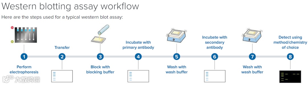 WB 的主要工作原理是采用聚丙烯酰胺凝胶电泳的方式按照分子量大小来分离蛋白质,经过凝胶分离的蛋白质样品转移到固相载体(例如硝酸纤维素薄膜)上,固相载体以非共价键形式吸附蛋白质,以固相载体上的蛋白质或多肽作为抗原,用对应的第一抗体结合蛋白质,再用酶标记的第二抗体结合第一抗体,通过底物显色以检测电泳分离的特异性目的蛋白成分,该技术广泛应用于检测蛋白水平的表达。它的主要步骤概括起来分为:1 .收集和准备蛋白样品;2 .电泳;3 .转膜;4 .封闭;5 .一抗孵育;6 .二抗孵育;7 .蛋白检测。以下流程图也展示了传统 WB 的基本工作流程: