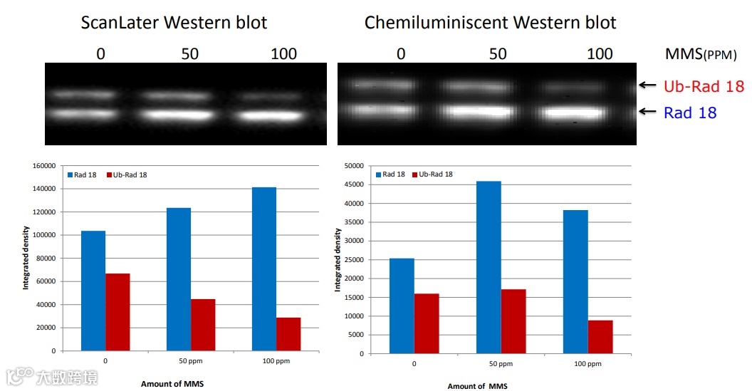 用不同浓度( 0 、 50 、 100 ppm)的致癌物质甲基甲烷磺酸盐( MMS )处理 HEK 293 细胞,检测泛素化的 Rad-18 。ScanLater Western Blot 与化学发光 Western Blot 一样敏感,也更精确。数据由斯坦福大学 J-R Rin 和 K Cimprich 提供