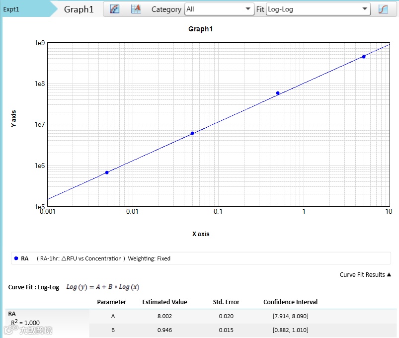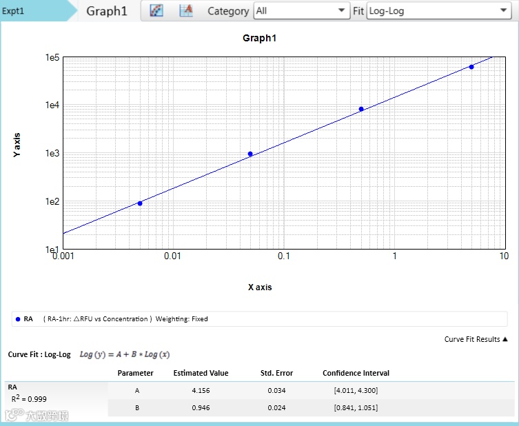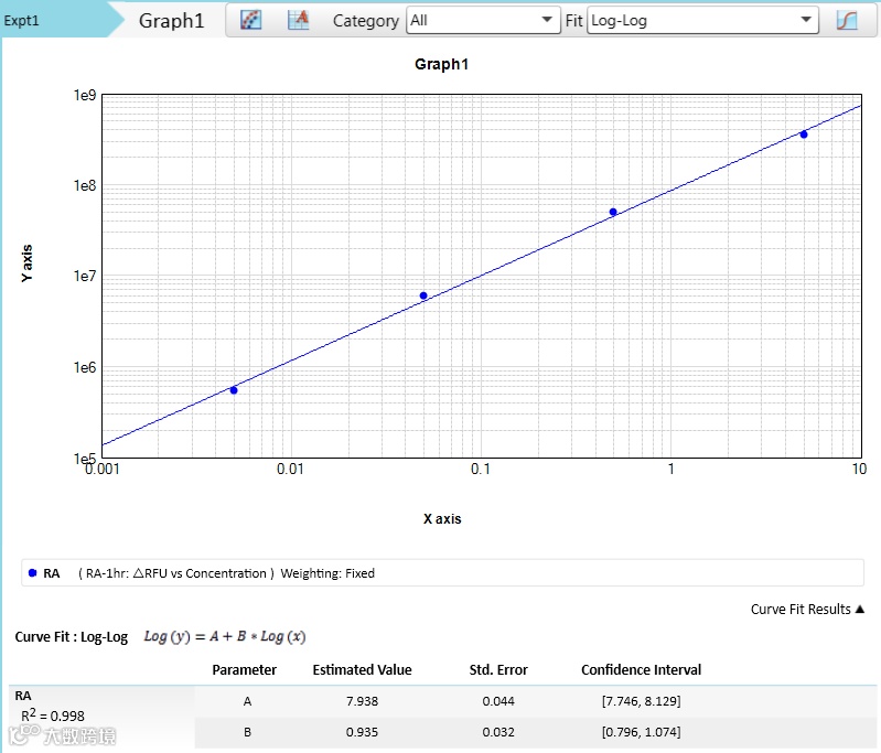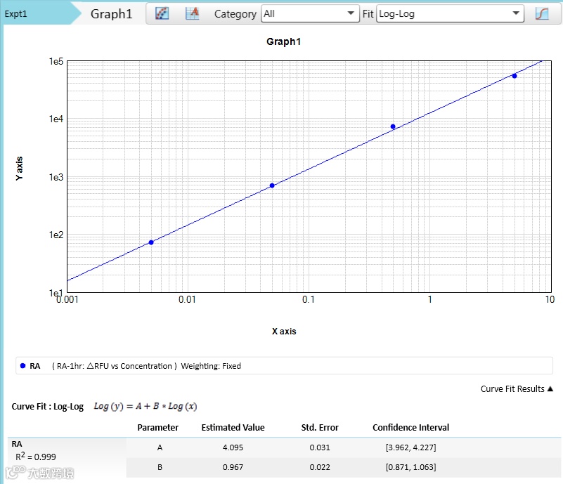 标准品/样品净 ΔRFU=标准品/样品 ΔRFU-阴性对照 ΔRFU 以内毒素工作标准品溶液浓度为横坐标,净 ΔRFU 为纵坐标绘图并进行 Log-Log 拟合,log(ΔRFU) = A*log(内毒素浓度 EU/ml)+B