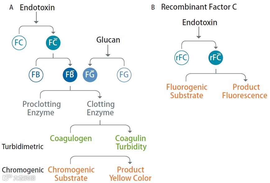 图 1 酶促级联反应 LAL(A)和重组 C 因子 rFC 分析(B)。rFC 分析包括一个一步的酶联反应,消除了对鲎的需要,同时避免葡聚糖引起的 G 因子非特异性干扰造成的假阳性