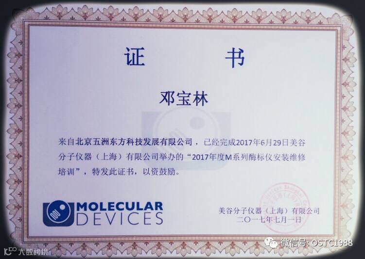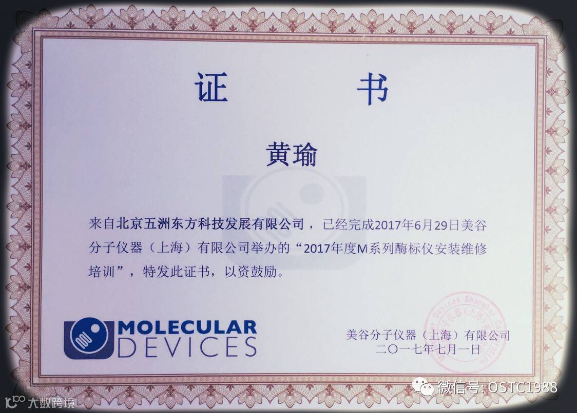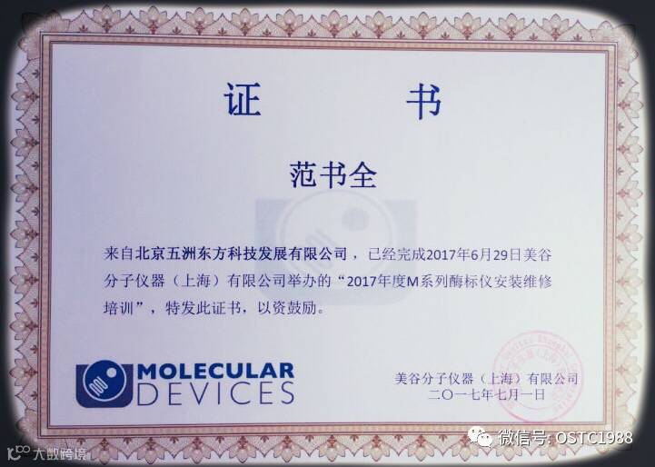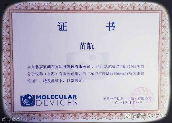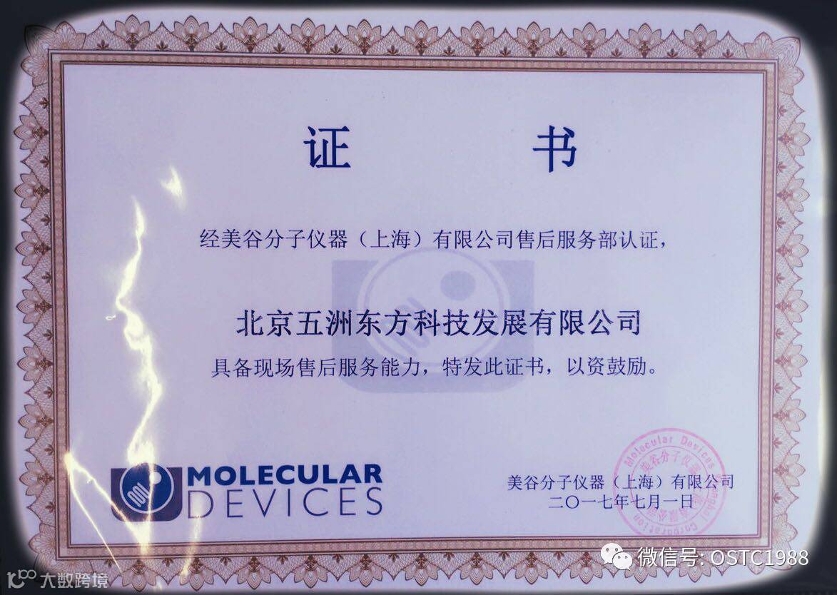 热烈祝贺北京五洲东方科技发展有限公司经过美谷分子仪器(上海)有限公司售后服务部认证,获得了MD授权颁发的“具备现场售后服务能力”的资质证书!