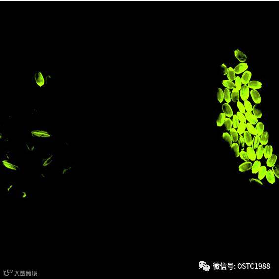 图片是水稻种子的荧光检测。左侧为阴性对照,右侧为处理。