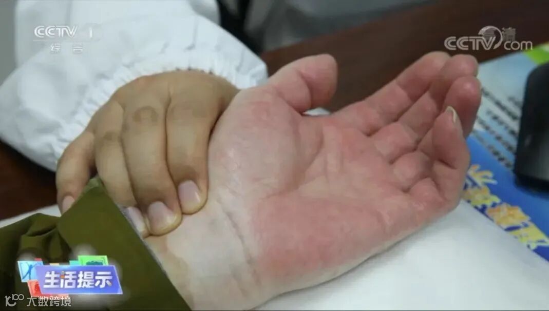 看手掌大拇指和小拇指的根部鱼际处,容易出现片状充血或是红色斑点、斑块,且加压后会变成苍白色,再仔细一点观察,可见大量扩展连片的点片状小动脉。
