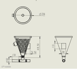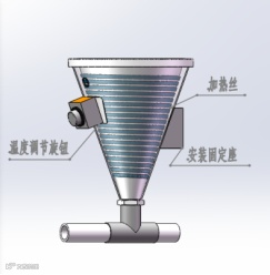 预热式接收料斗用于将料斗滑下的粉末产品加热干燥后送进文丘里管。料斗由两个重叠的锥体构成,两个锥体之间构成一个15mm宽的腔体。在腔体中,内层锥体缠绕的大约2米长的电热带,上面覆盖一层绝热材料,以确保大部分热量传递到料斗内部,本组件为密封件,加热组体通过与安装在料斗外部的接线盒相连。预热式接收料斗配有一个盖子,可以防止潮湿空气、碎片进入料斗。同时也可以标定螺旋喂料器送料以及为文丘里管吸入空气做准备。