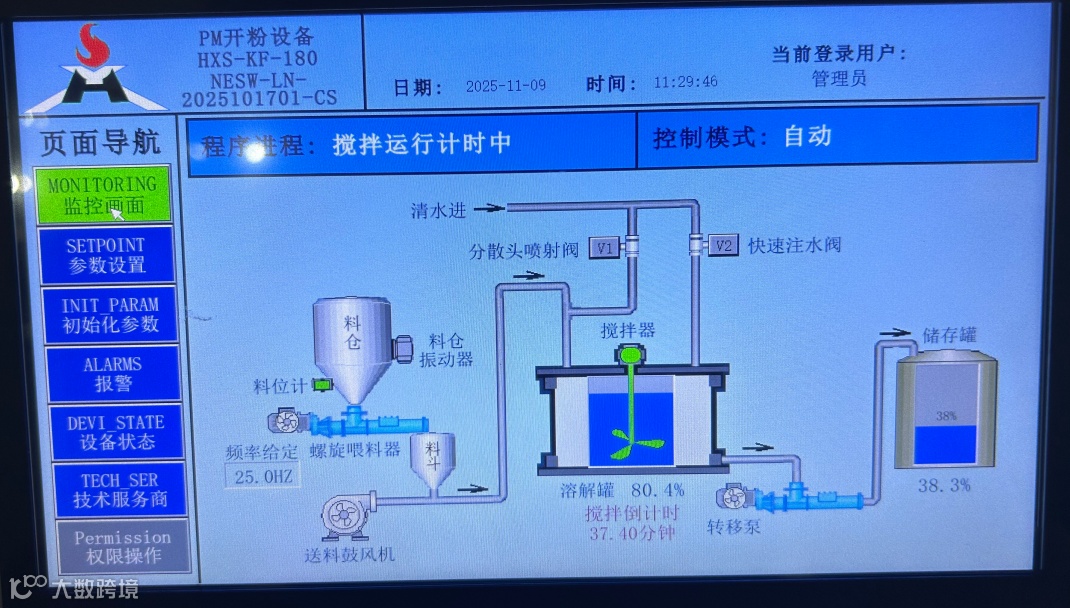 自动喷湿制备系统用于将粉末PAM充分分散、均匀混合成溶液,然后输送到储存槽中,再根据工厂工艺要求添加到工艺系统中。根据工厂的工艺条件,溶被的浓度(按PAM的供应商的要求)在添加到工艺系统时需要进一步的在线稀释,有些是可以直接添加的。本系统的设计为连续循环加粉的操作。
