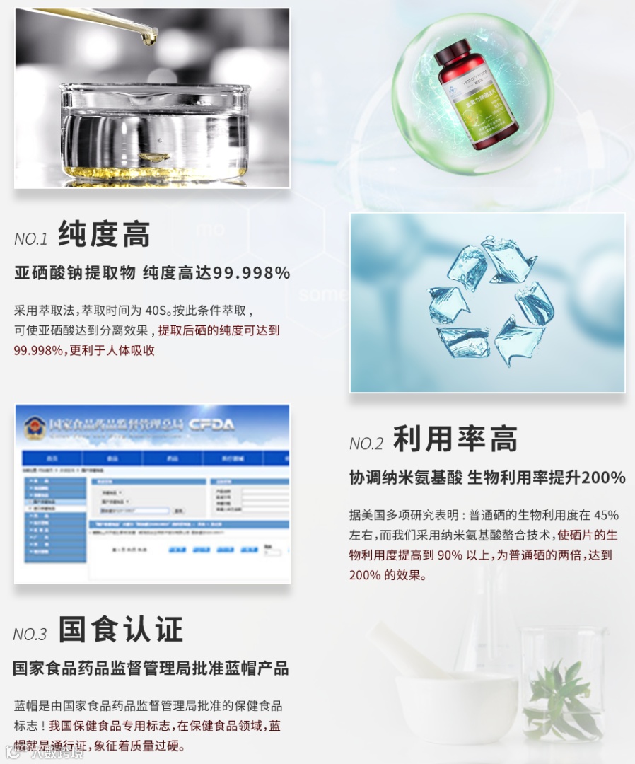 硒是人体必需的微量元素,对于大家来说,应该并不陌生,早在1973年,美国官方机构食品卫生管理局明文规定,为保证人能获得足够的硒,可食用动物的饲料中,必须添加一定量的硒。是人类迄今发现的最重要的抗衰老元素,在国际医药界和营养学界被誉为“生命之火”、“抗癌之王”、“心脏的守护神”。