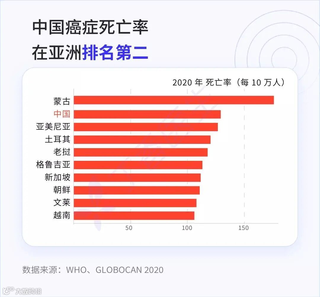 但放到更大的范围来看,情况并没有那么乐观。在整个亚洲里,2020 年中国的癌症死亡率排名第 2。