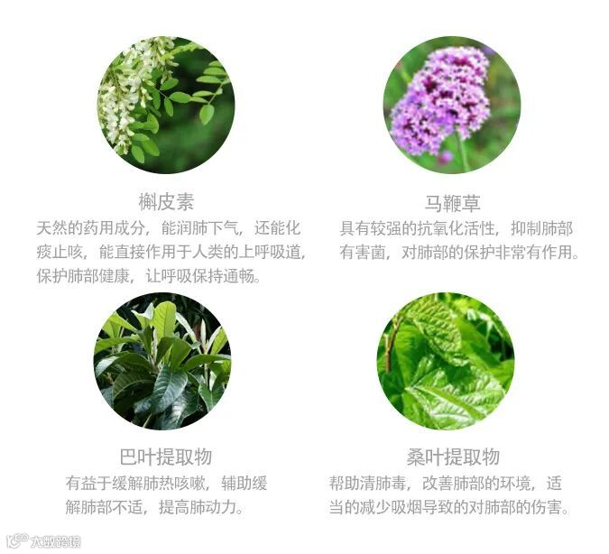 除此之外还添加了槲皮素、马鞭草、巴叶、桑叶等天然珍贵植物提取物,精良的配比能够全面改善肺部环境,缓解肺部不适,抗菌抗病毒,防癌抑癌。