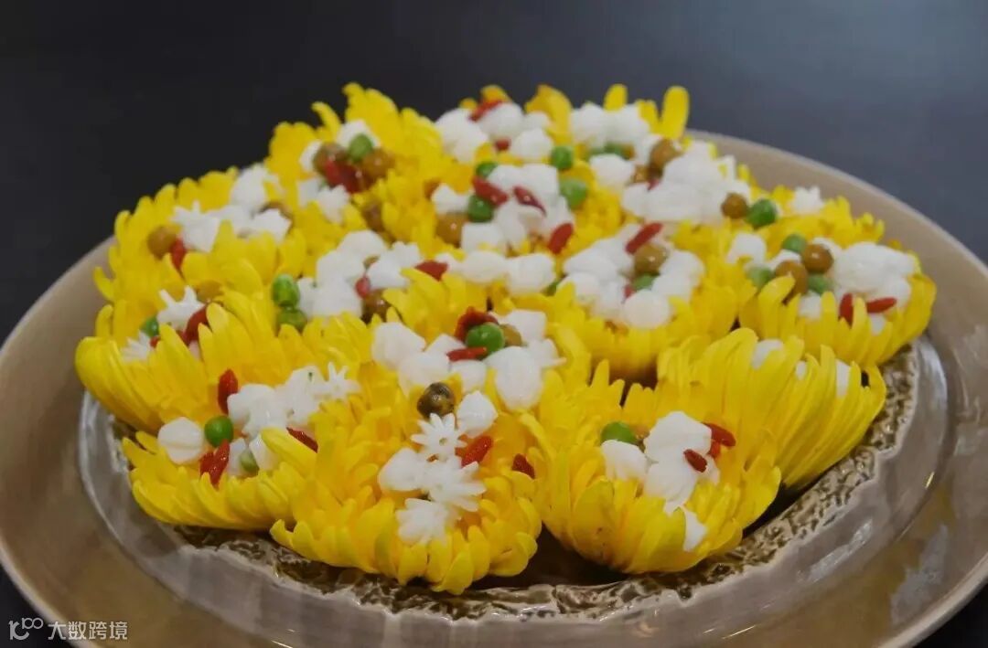 菊花药效及营养价值高,气味芬芳,绵软爽口,是入肴佳品。吃法也很多,可鲜食、干食、生食、熟食,焖、蒸、煮、炒、烧、拌皆宜,还可切丝入馅,菊花酥饼和菊花饺都非常受人喜爱。