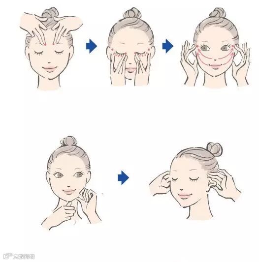 1、从脸部内侧开始,由内而外、从左至右,慢慢按摩,提升皮肤紧实度。