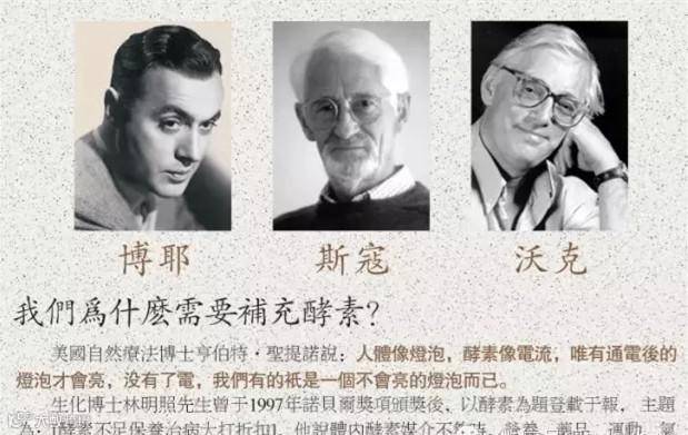 生化博士林明照先生曾于1997年诺贝尔生化奖颁奖后,以酵素为题登载于报,主题为:“酵素不足,保养治病大打折扣”,他说体内酵素媒介不够时,营养、药品、运动等效果无法发挥。