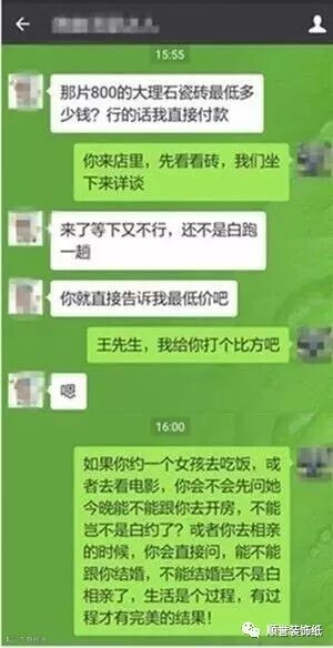 曾在家具朋友圈里看到这样一则对话,对话内容主要是客户在微信里追问销售员一片800x800规格大理石瓷砖的底价,甚至威胁销售员如果不给底价就不去他们店买砖。