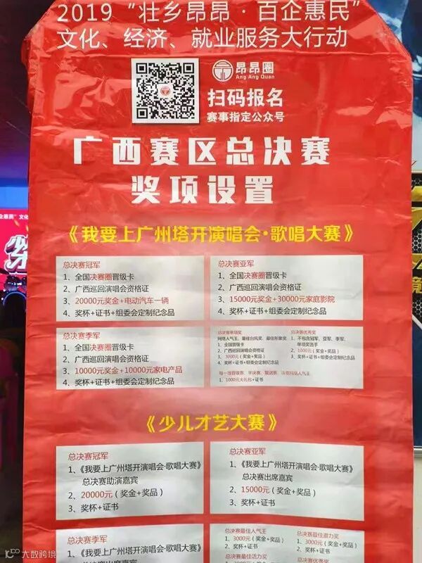 2019年4月,由一带一路中国品牌博览会、华雄文化、趣嗒嗒科技、壮乡昂昂联合打造的2019"壮乡昂昂·百企惠民"文化、经济、就业服务大行动之《我要上广州塔开演唱会·歌唱大赛》、《少儿才艺大赛》、《广场舞大赛》三赛联动,在广西震撼启动,本季赛事将遍及整个广西140多个区县。