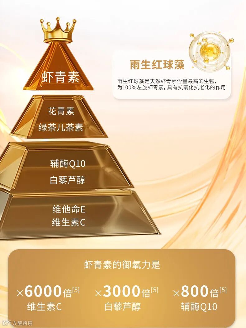 雨生红球藻:天然虾青素含量最高的生物,100% 左旋虾青素,抗氧力是维生素 C 的 6000 倍、白藜芦醇的 3000 倍,能快速清除自由基,改善熬夜、日晒导致的暗沉;