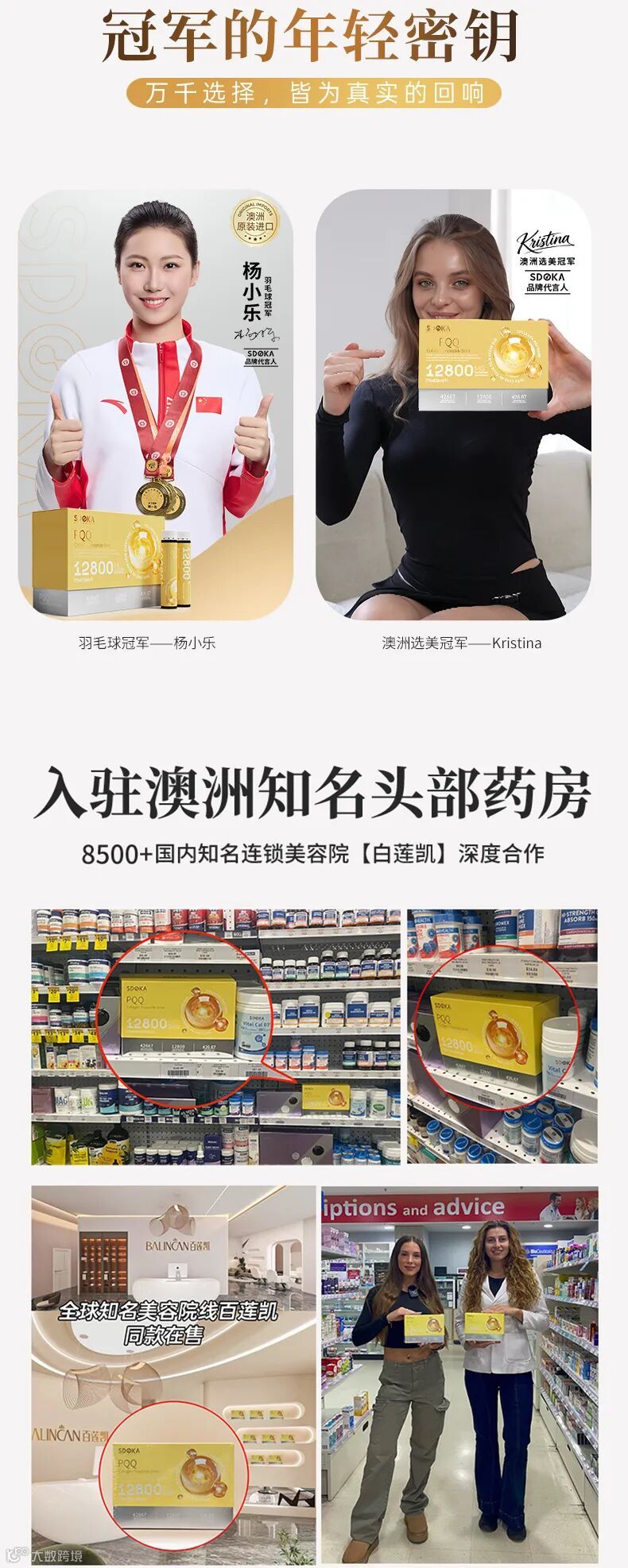 SDOKA源自澳洲,由上市公司生产,澳洲TGA药品级标准把关,已入驻澳洲知名药房。羽毛球冠军杨小乐、澳洲选美冠军Kristina均为其代言,国内8500+美容院线(如百莲凯)深度合作。