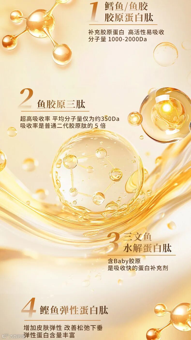 鳕鱼/鱼胶原蛋白肽:高活性易吸收,快速填补胶原空洞,提升皮肤含水量。