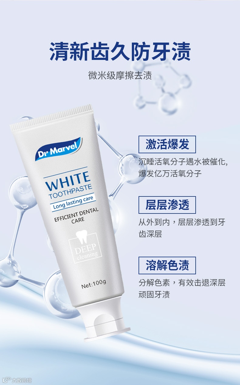针对咖啡渍、茶渍、烟渍这些顽固分子,Dr.Marvel添加了特殊的溶解酶成分,能够针对性地分解这些色素分子。