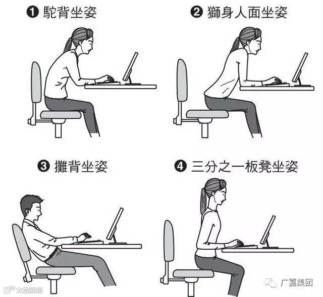 如果你不得不久坐,那就尽量以正确的坐姿坐。首先要保证坐直了,不要前倾;肘部弯成90度;脚平放在地上;肩膀放松;手臂紧贴身侧;后背部要有支撑,尽量靠在椅背上。