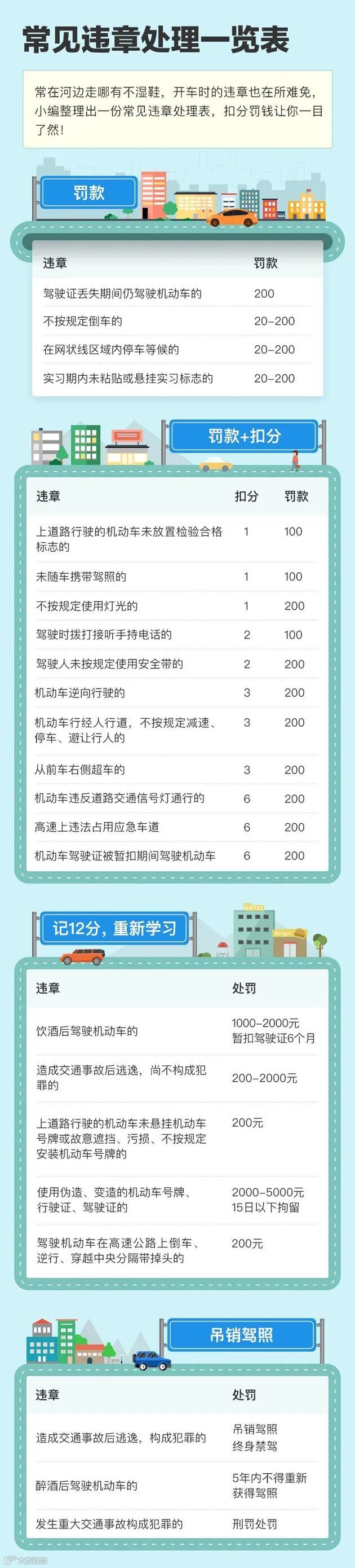 太实用!常见违章处理一览表,收藏起来,违章后看它就够了!