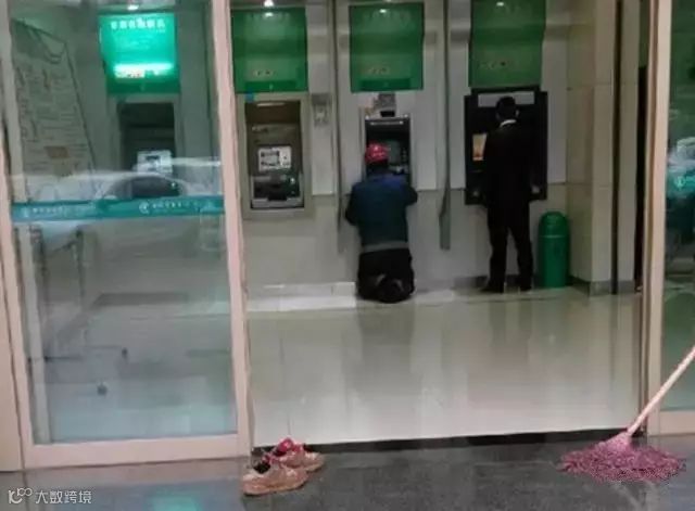 保安说,没事没事,你进去,我一会儿再拖一次。可农民工却坚持脱了鞋,跪着去ATM机前进行操作。