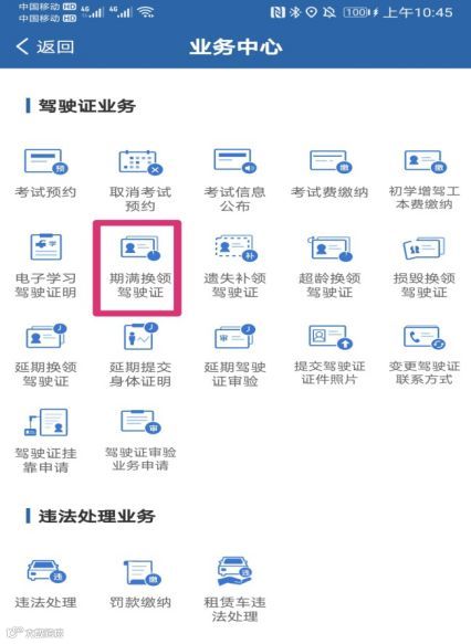 “交管12123”手机App选择驾驶证业务下“期满换领驾驶证”: