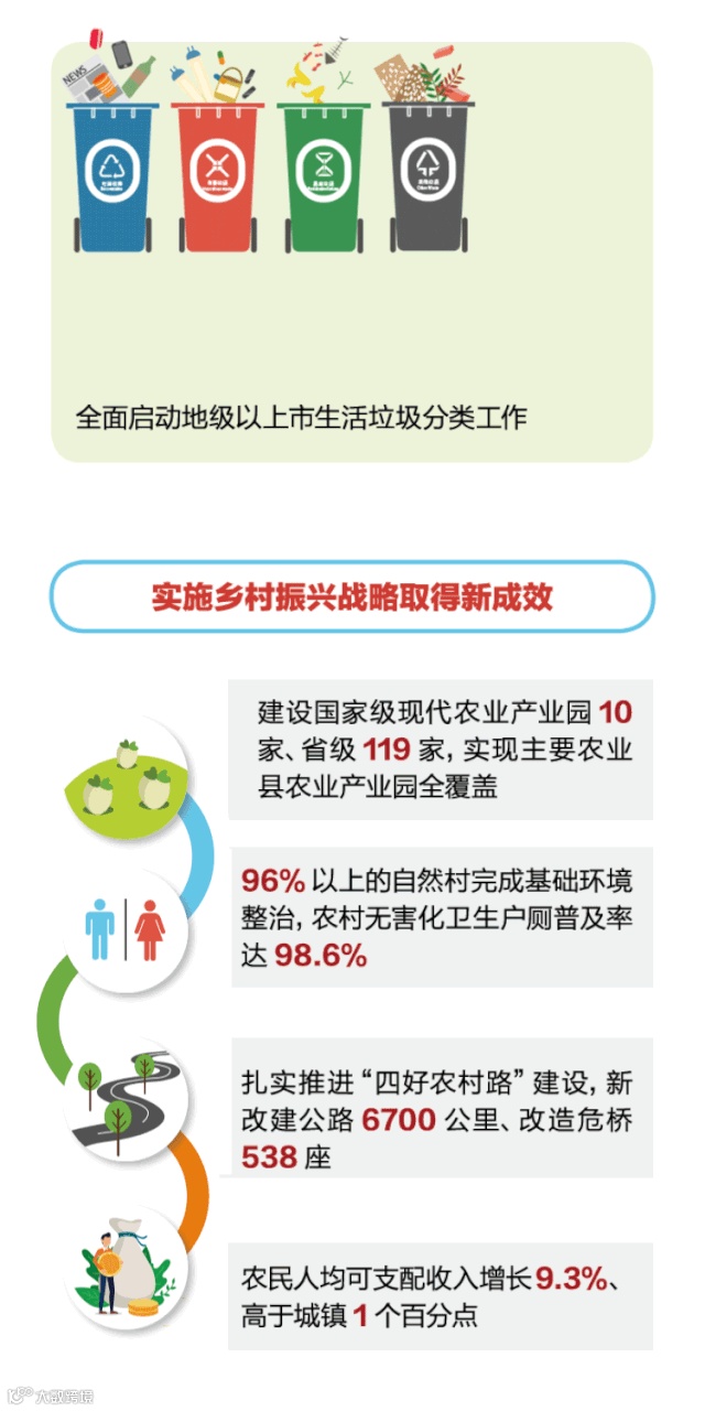 实施乡村振兴战略取得新成效,推进“千村示范、万村整治”工程,96%以上的自然村完成基础环境整治,但农业生产规模化产业化水平有待提高,农村人居环境整治任务依然繁重,破解城乡二元结构还需下更大功夫。