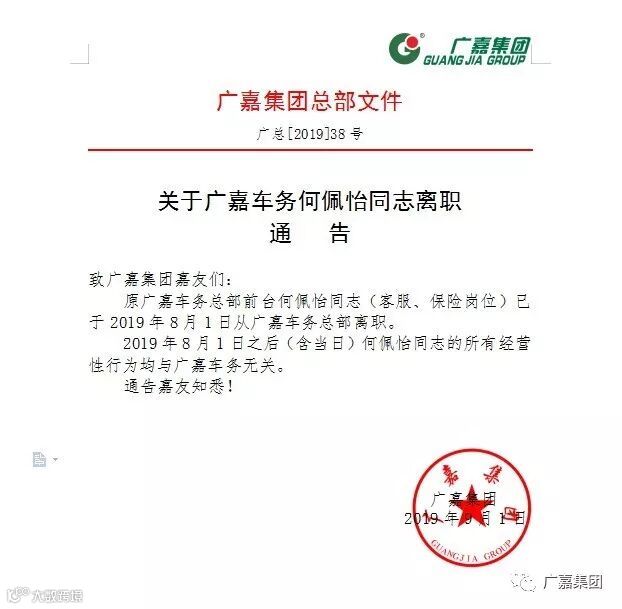 原广嘉车务总部前台何佩怡同志(客服、保险岗位)已于2019年8月1日从广嘉车务总部离职。
