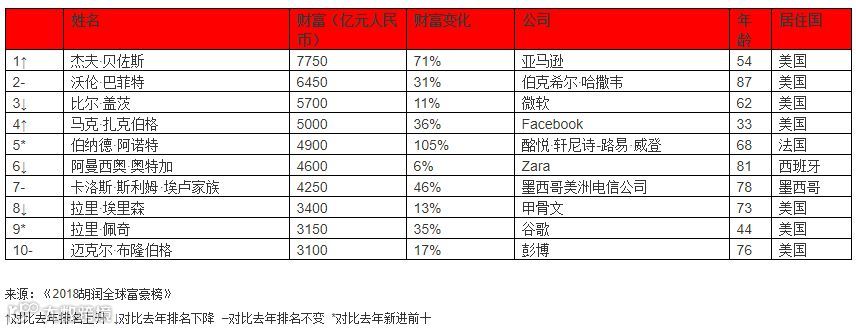 在这份榜单中,全球前十大富豪,依旧是美国人占多数。其中,马云的竞争对手,亚马逊创始人杰夫·贝佐斯财富较去年上涨了71%,以7750亿元的财富估值,首次晋升为世界首富。股神巴菲特、比尔·盖茨则紧随其后。