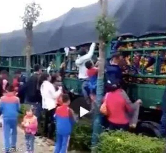 而最引人注目的,莫过于一些接学生的家长,他们一窝蜂爬到车上哄抢,而他们身后,是张开塑料袋接橘子的孩子,甚至,还有家长带着孩子一起爬到货车上抢。