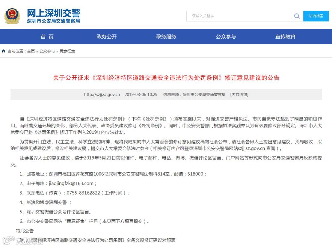 前段时间,深圳市公安局交通警察局发布了关于公开征求《深圳经济特区道路交通安全违法行为处罚条例》修订意见建议的公告▼