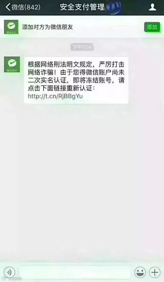01、打开所谓的“安全支付管理”消息,显示其可以添加此账号为好友,而微信服务的各类公众号只能关注,而不是添加好友;