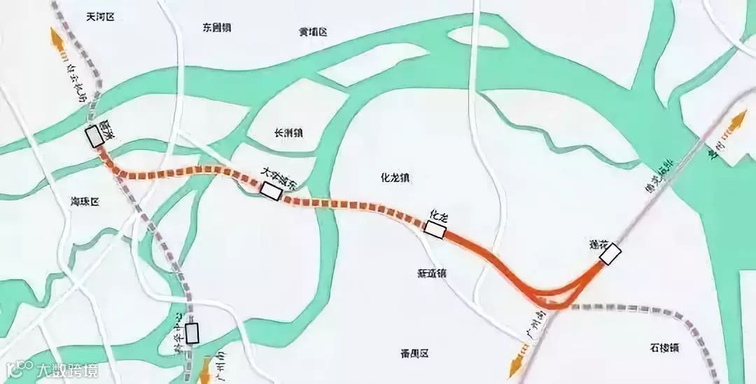 经海珠区、黄埔区、番禺区,接入佛莞城际轨道莲花站,设大学城东站和化龙站等2座车站。建设期限为2017年至2022年。