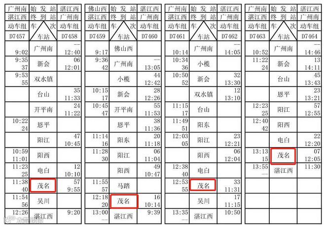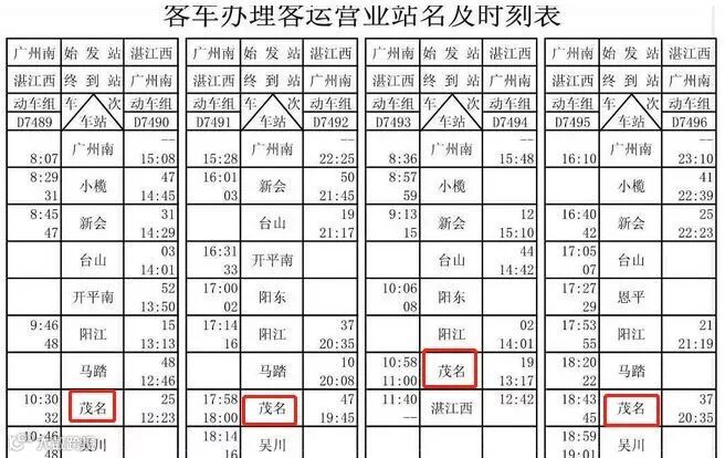 始发:湛江西(8:00)——茂名(8:35)——广州南(10:58)