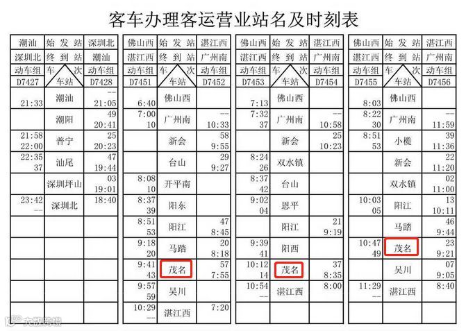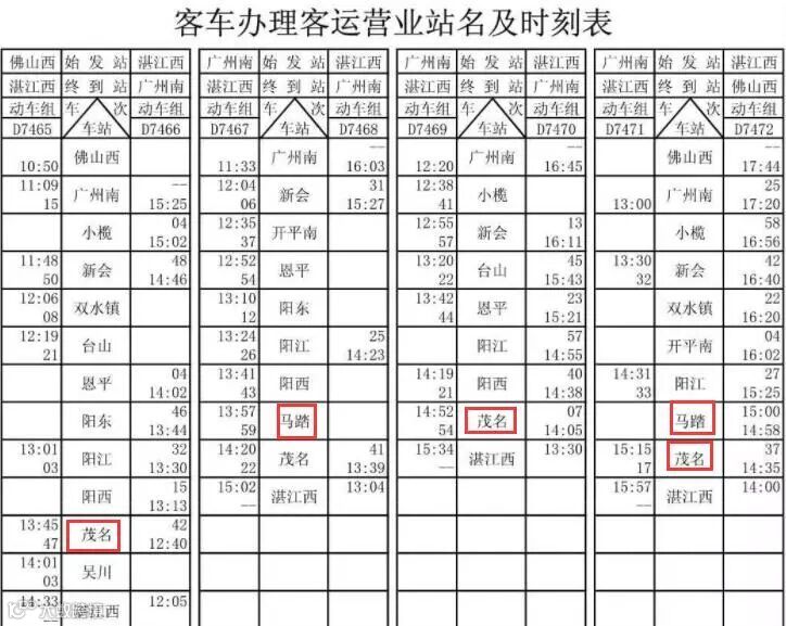 始发:湛江西(7:20)——茂名(7:55)——马踏(8:18)——广州南(10:33)