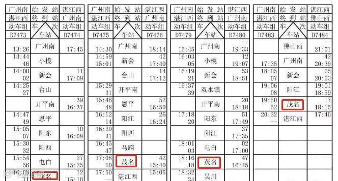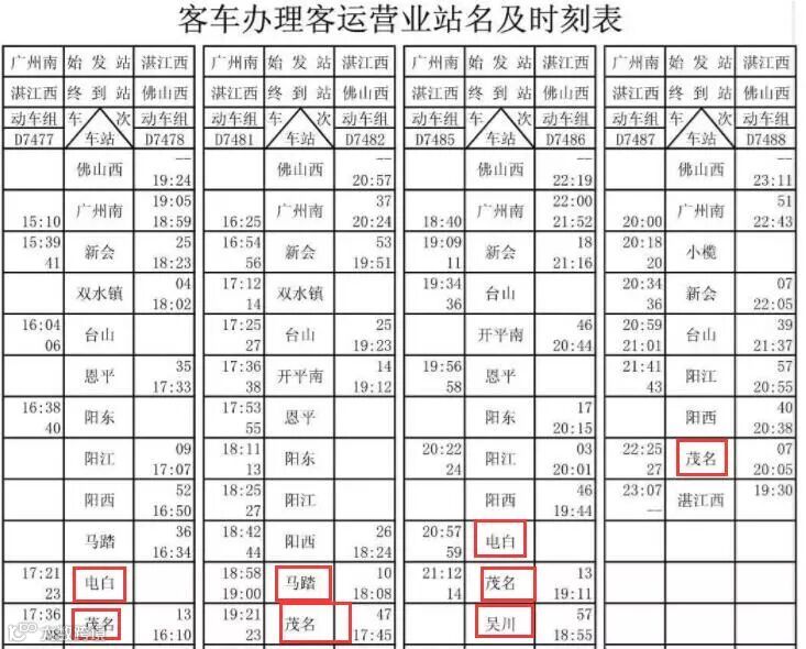始发:湛江西(9:20)——茂名(9:55)——电白(10:10)——广州南(12:40)