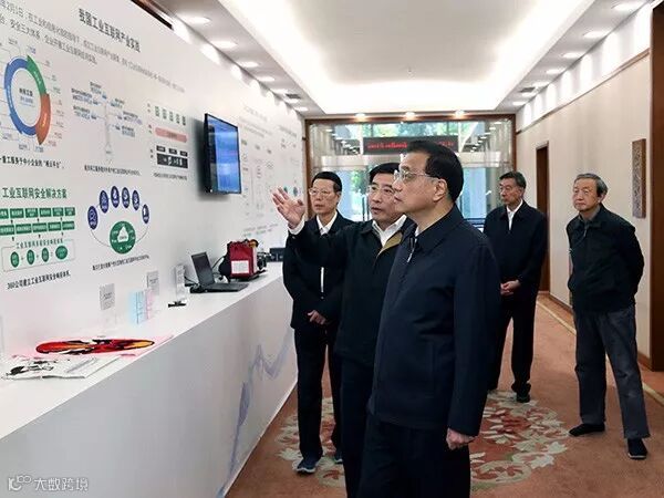 当天会议开始前在通往国务院第一会议室的走廊上,总理停住了脚步,和其他国务院领导首先参观了一个“工业互联网”展览。
