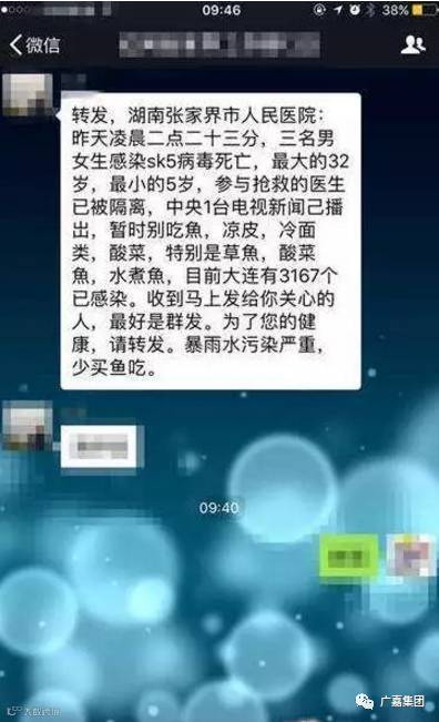 社交网络流传一则消息:昨天凌晨二点二十三分,三名男女生感染SK5病毒死亡,最大的32岁,最小的5岁,参与抢救的医生已被隔离,中央1台电视新闻已播岀,暂时别吃鱼类、酸菜,特别是草鱼,酸菜鱼,水煮鱼。“新型病毒”来袭,引发一些网民恐慌。