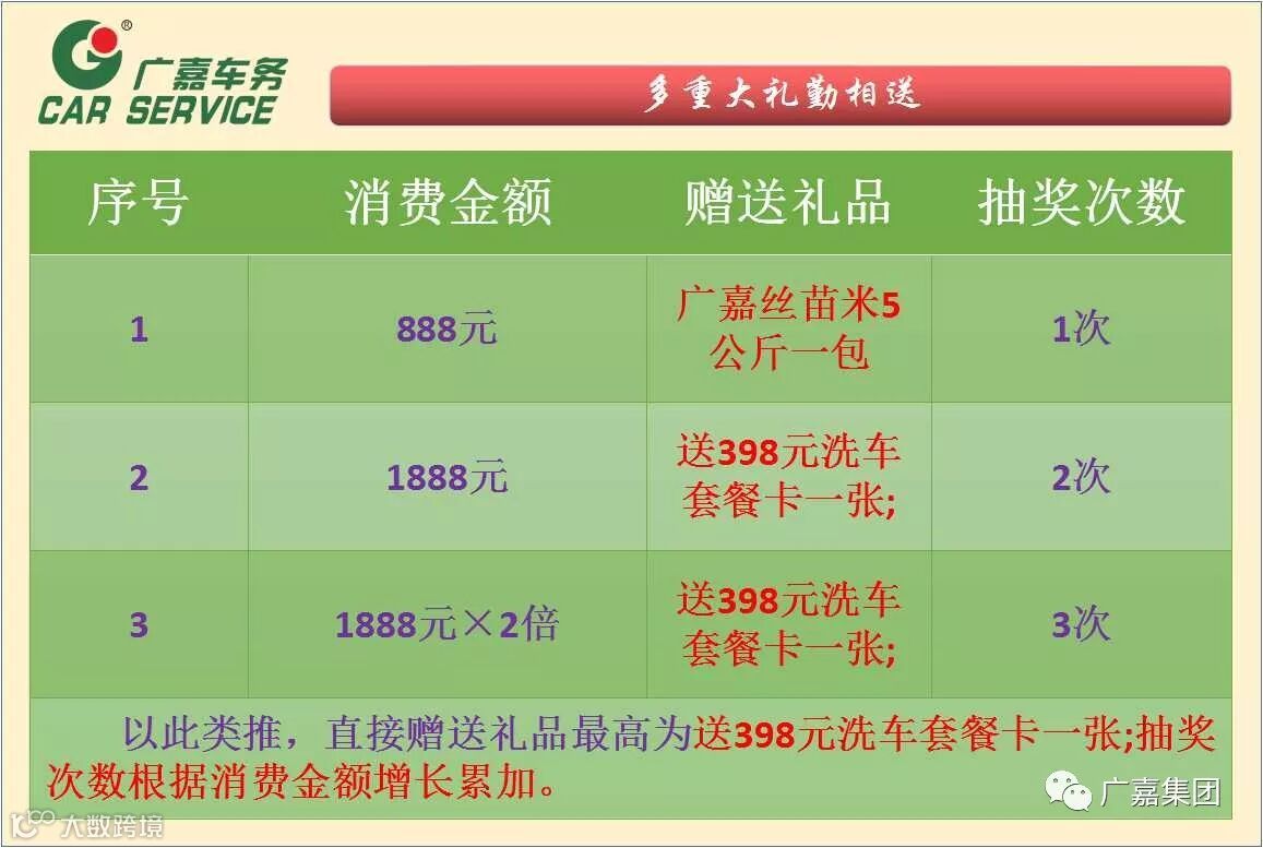 二、消费888元送广嘉丝苗米5公斤一包,1888元送398元洗车套餐卡一张;