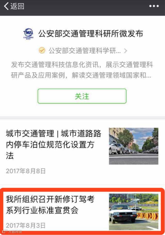 近日,配套驾考改革和《公安部关于修改<机动车驾驶证申领和使用规定>的决定》(公安部令第139号)实施,公安部交通管理科学研究所完成了《机动车驾驶人考试内容与方法》(GA 1026)等驾驶人考试相关行业标准修订,标准将于2017年10月1日正式实施。