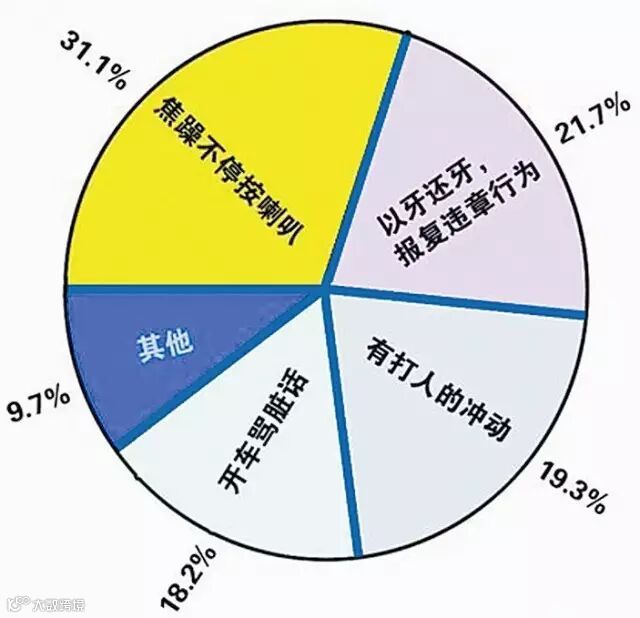 有调查显示,因堵车和路况不佳导致动怒的有48.1%;因看到别人违章,影响到自己行车动怒的39.8%;因周边车辆加塞或者超车动怒的为29.7%;还有别人违章,即使没有影响到自己也动怒的有26.6%;因新手开车不懂规则动怒的有22.9%。路怒已经成了很多人的常态,另一份调查显示,相当一部分交通事故是由于路怒引起的。