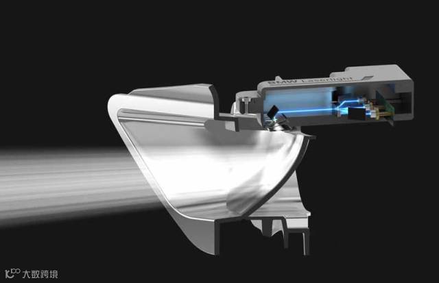 激光大灯的原理比想象中的还是要稍微简单一点,通电后大功率蓝光激光二极产生蓝色的激光,随后激光穿过黄磷透镜,蓝色的激光变成普通白光,然后经过配光镜反射到路面。