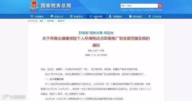 日前,财政部、税务总局、保监会等三部门联合下发《关于将商业健康保险个人所得税试点政策推广到全国范围实施的通知》,自2017年7月1日起执行。