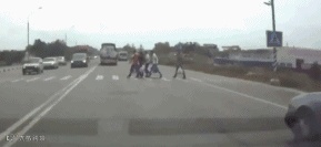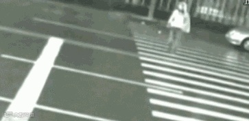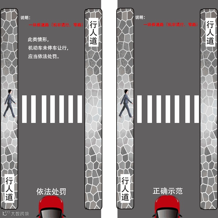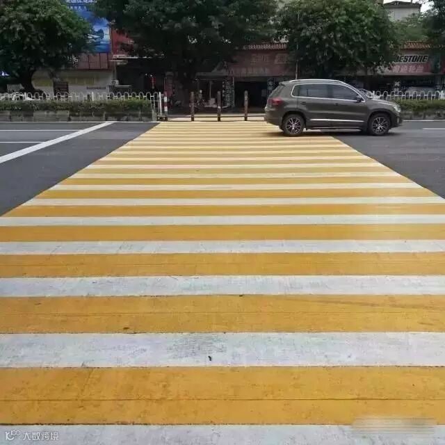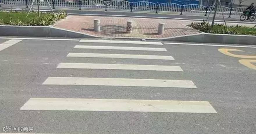 道路中央有双黄线或隔离栏,无绿化隔离带,行人步入斑马线,车辆必须让行。